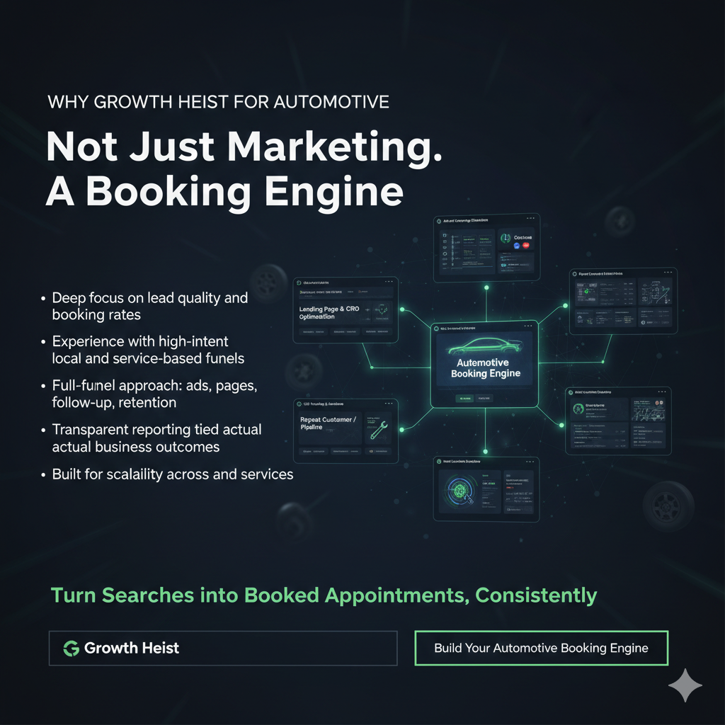 At Growth Heist, we don’t just “run ads”. We build end-to-end lead and booking systems that consistently turn searchers and browsers into booked appointments and enquiries.
